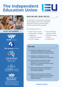 The Independent Education Union of Australia (IEUA) with a current membership of over 75,000, is the federally registered industry union representing all employees working in non-government schools and institutions across Australia. Included in its membership are teachers, principals and ancillary staff in faith based, community and independent schools and early childhood education and care centres, and post secondary centres across Australia.